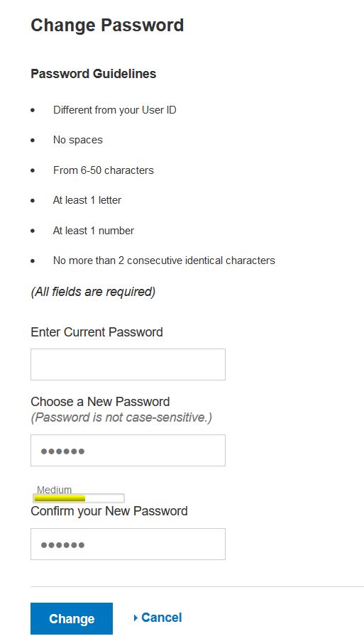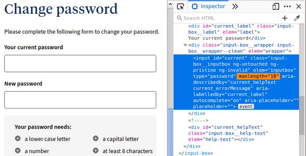 Passwords need: - a lower case letter - a number - a capital letter - at least 8 characters In the 'Change password' form, passwords are now restricted to a `maxlength` of 18. If your current password is longer than 18 characters, you won't be able to change your password. When I contacted them about this, they "passed on" my "experience and concerns" for review and simply reset my password. Now I wish I'd just said nothing and kept my 50-character password.
