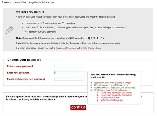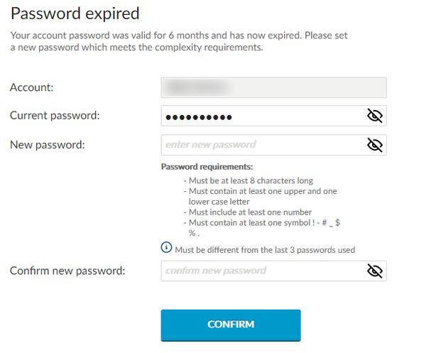 Password rules: - be between 8 and 30 characters - include at least 1 number, 1 letter and 1 special character (@#%^ etc) - have no more than 2 repeating characters (AAB not AAA) - not contain spaces - not be the same as your last 3 passwords