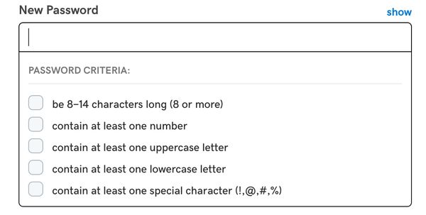 Password: - Must be at least 8 characters long - Must contain at least 1 number - Must contain at least 1 letter or special character - Must not be a well known or common password
